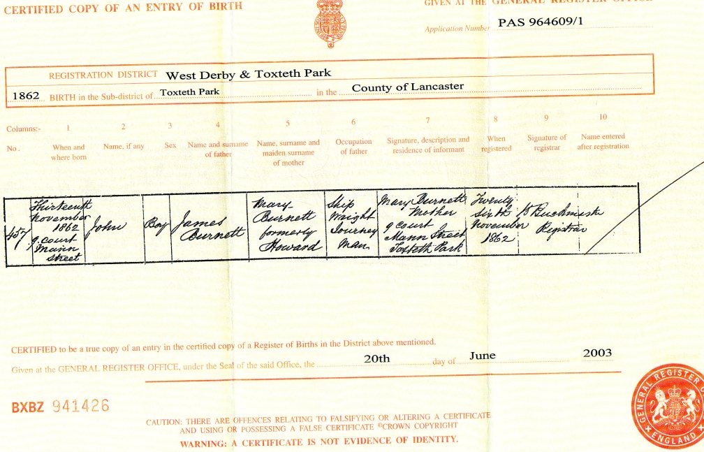 Her father James BURNETT, carpenter or sometimes as a shipwright, died in 1877 due to an accidental fall into a graving dock. He died at 12 Rankin Street, Toxteth Park and was concussed for 10 hours before he passed over. An inquest was held on 14th December 1877.
